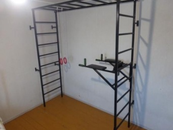 Ширина шведских стенок и рукохода 60 см, высота 2.4 м, длина рукохода 2м. Комплекс комплектуется съемными (навесными) брусьями-пресс (кольца в комплектацию не входят).