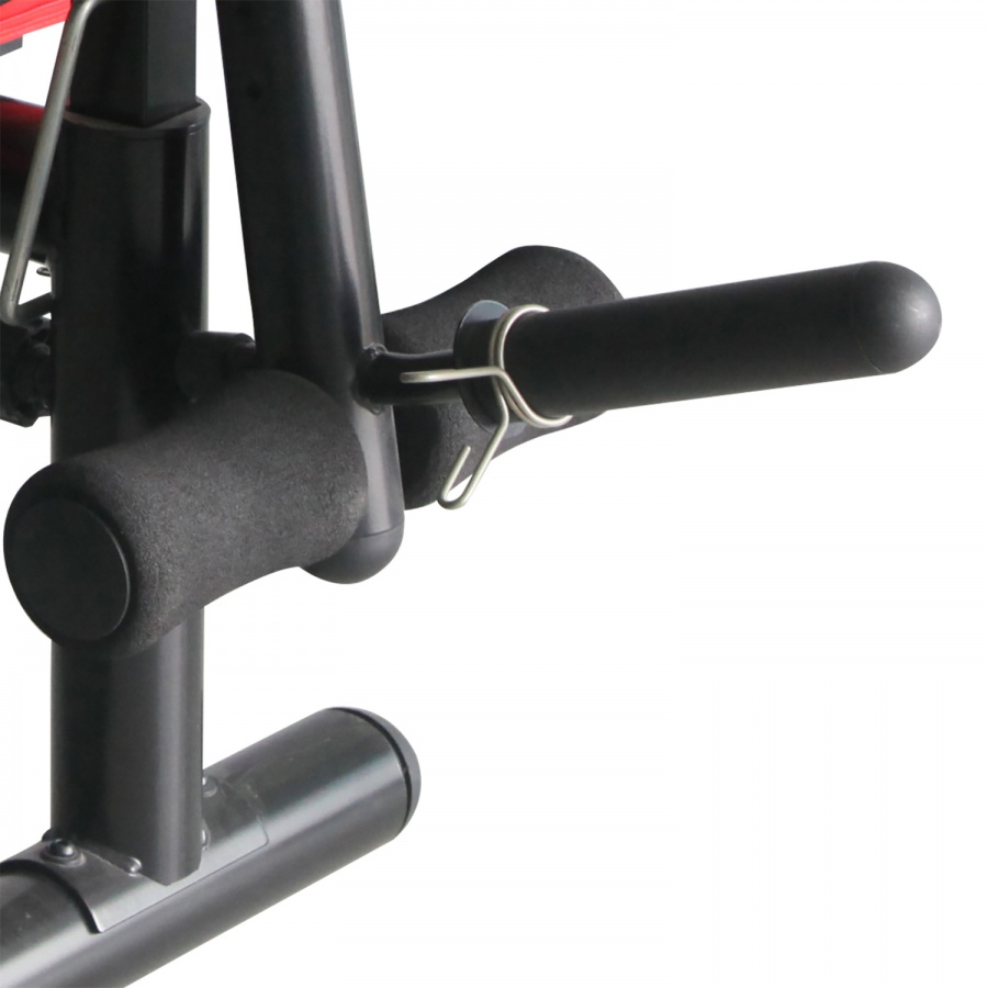 Рычаги блока для ног снабжены мягкими валиками. Стойки тренажера регулируются по высоте.