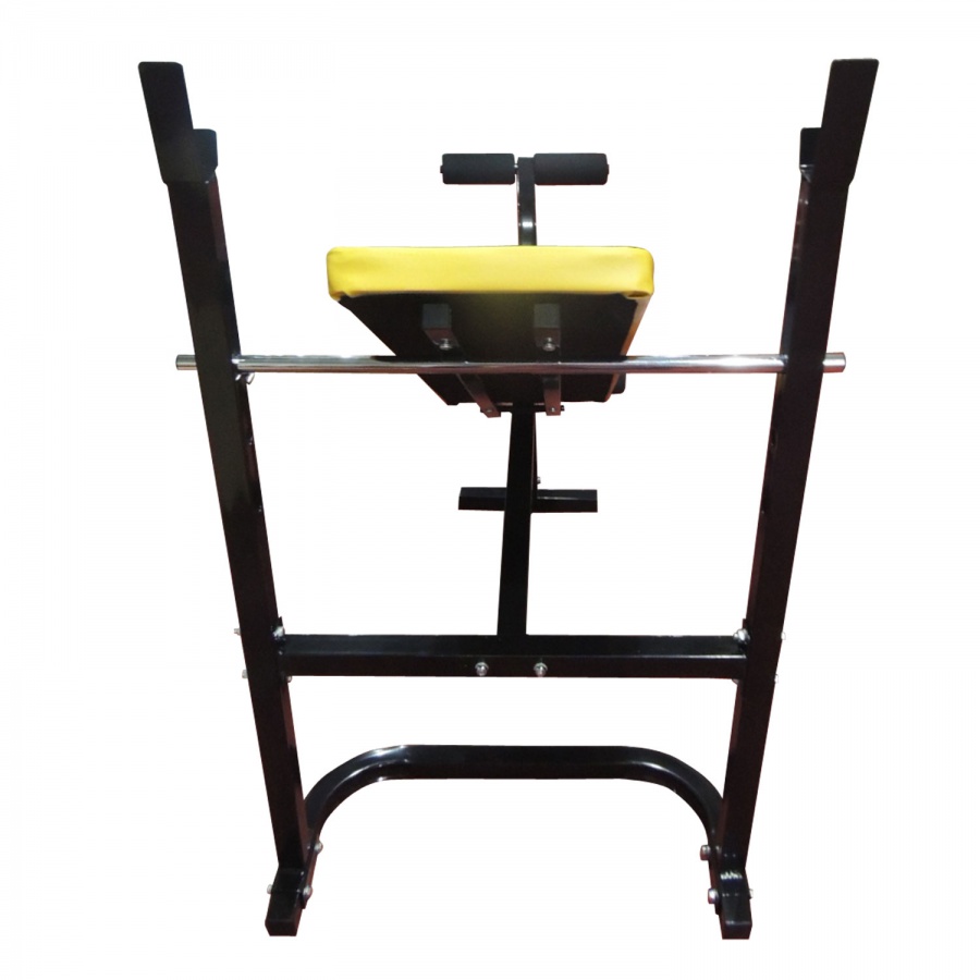 Силовая скамья со стойками многофункциональная, с ударопрочным эмалевым покрытием. Позволяет выполнять упражнения: жим лежа, сгибание и разгибание ног в коленном суставе. Усиленные стойки для штанги надежно фиксируют штангу, что обеспечивает безопасность при выполнении упражнений. Рычаг для ног снабжен мягкими валиками. Регулируемый угол наклона спинки. Штанга и диски в комплект не входят. В качестве нагрузки используются диски диаметром 26 мм.