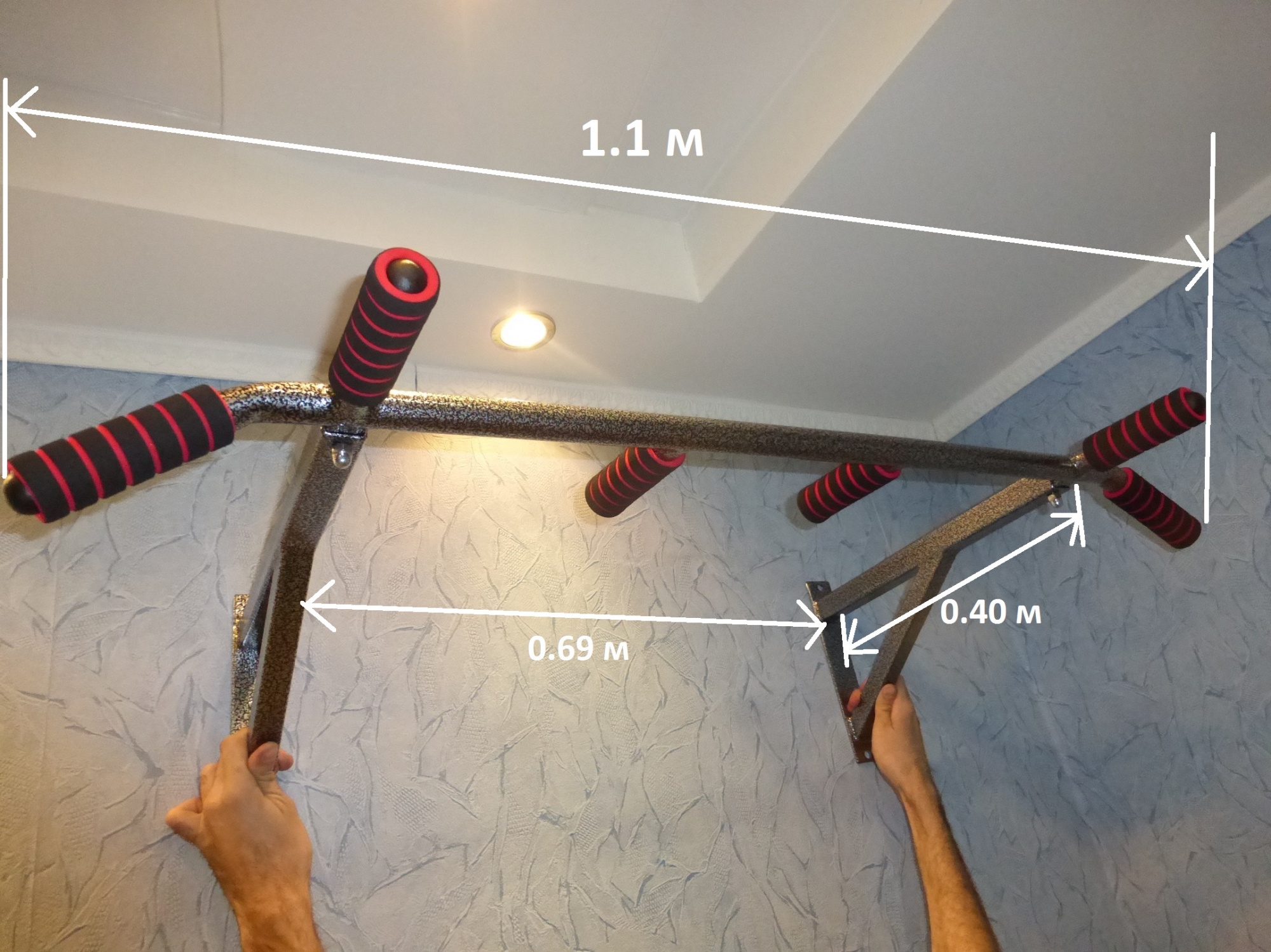 • Габариты турника: длина прекладины 1.1м, расстояние от стены 0.40м, расстояние между кронштейнами крепления к стене 0.69м, диаметр перекладины 28мм. С  дополнительными ручками 4 шт., (наружу и внутрь) для поперечного подтягивания. Данные габариты позволяют комфортно подтягиваться узким и широким хватами, и выполнять различные упражнения на турнике.