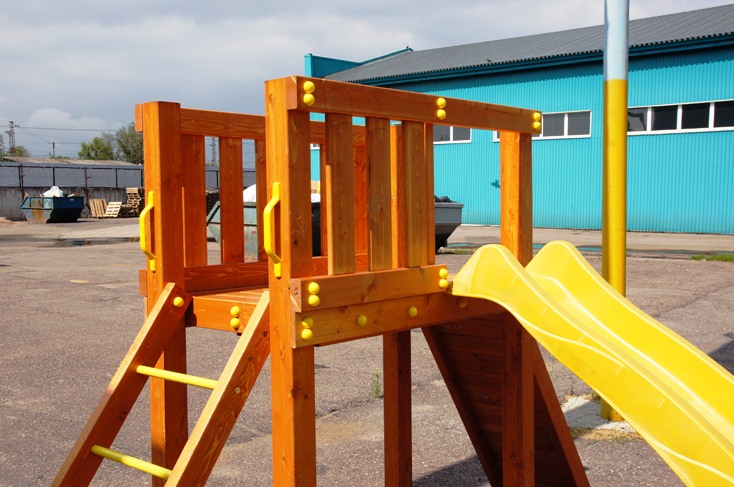 Каркас игровой площадки изготовлен из многослойного клееного соснового бруса толщиной 85мм, пол, ограждения из массива сосны толщиной 17 мм.
