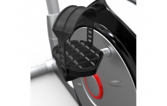 Широкие педали с регулируемыми ремешками и однокомпонентный шатун обеспечивают надежную поддержку ног во время тренировок. Дисплей монохромный LCD с подсветкой, а на нем отображаются следующие показатели: скан, время, скорость, расстояние, калории, пульс, восстановление пульса (recovery). Язык интерфейса - английский.